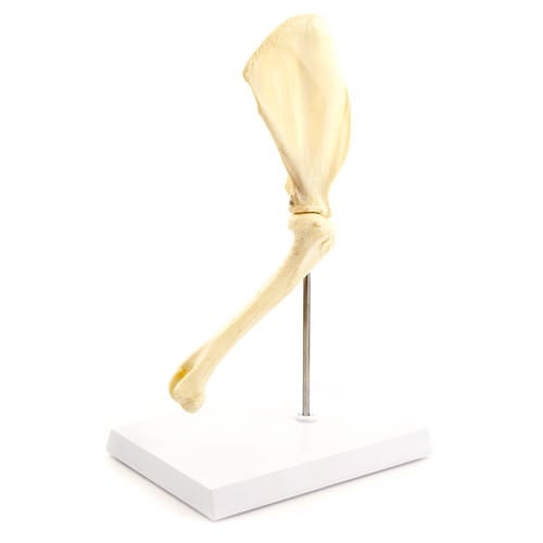 This immobile model from HeineScientific shows the skeletal structures of the shoulder of a medium-sized dog. The anatomical canine shoulder model measures 28 x 8 x 5 cm is mounted on a white plastic base and is used by vets for a simple representation of shoulder problems and therapy options. The artificial model is made of high-quality plastic and weighs 530 g.