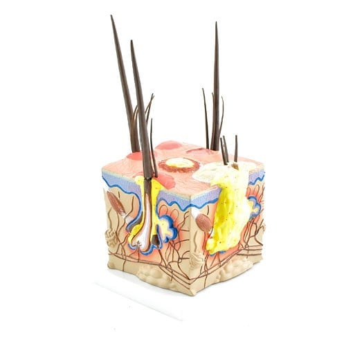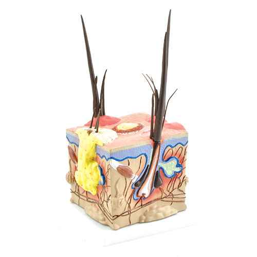 This anatomical canine skin model is a 4-sided block model that clearly shows the structure of a dog's skin. Thanks to its four sides, it is extremely rich in detail and clearly arranged for the viewer. The skin model was developed as an aid for patient counselling and therefore shows the typical skin changes/skin diseases of a dog.