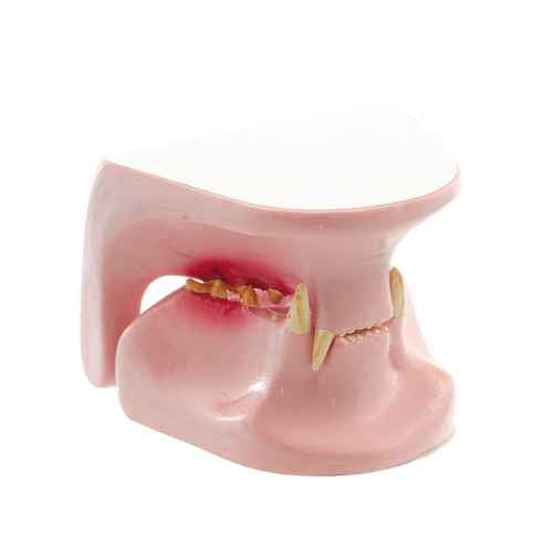 This anatomical model displays the jaw of a medium-sized cat with healthy and diseased teeth, as well as healthy and diseased gums. The jaw can be opened, closed and disassembled for closer examination. It is used in veterinary practices, animal shelters and animal breeding farms to draw attention to the need for adequate dental care and regular treatment. The feline jaw model has dimensions of 7 x 5 x 3 cm.