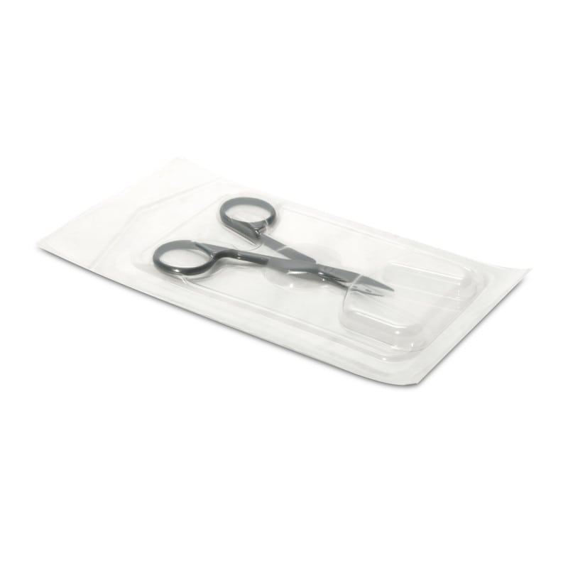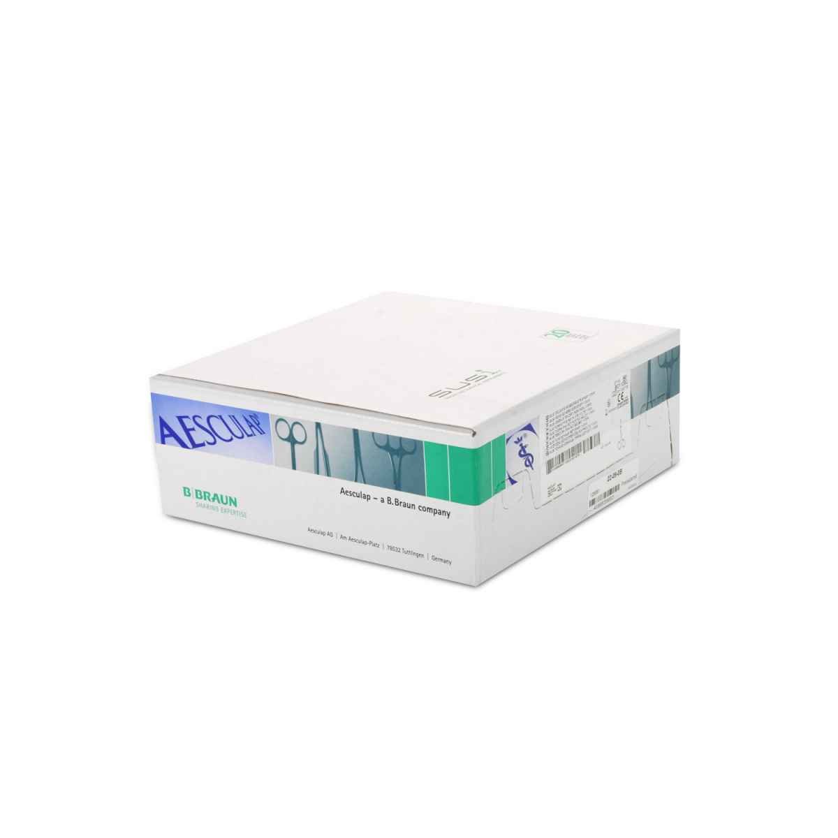These fine disposable scissors have straight, sharp-tip blades. They are SUSI (Single Use Surgical Instrument) scissors from Aesculap with a sterile shelf life of 5 years. This allows the scissors to be very economically stored.
